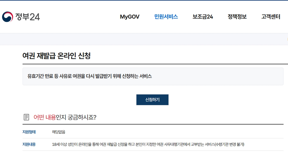 "아래 버튼 클릭 시 여권 재발급 온라인 신청 페이지로 이동합니다"